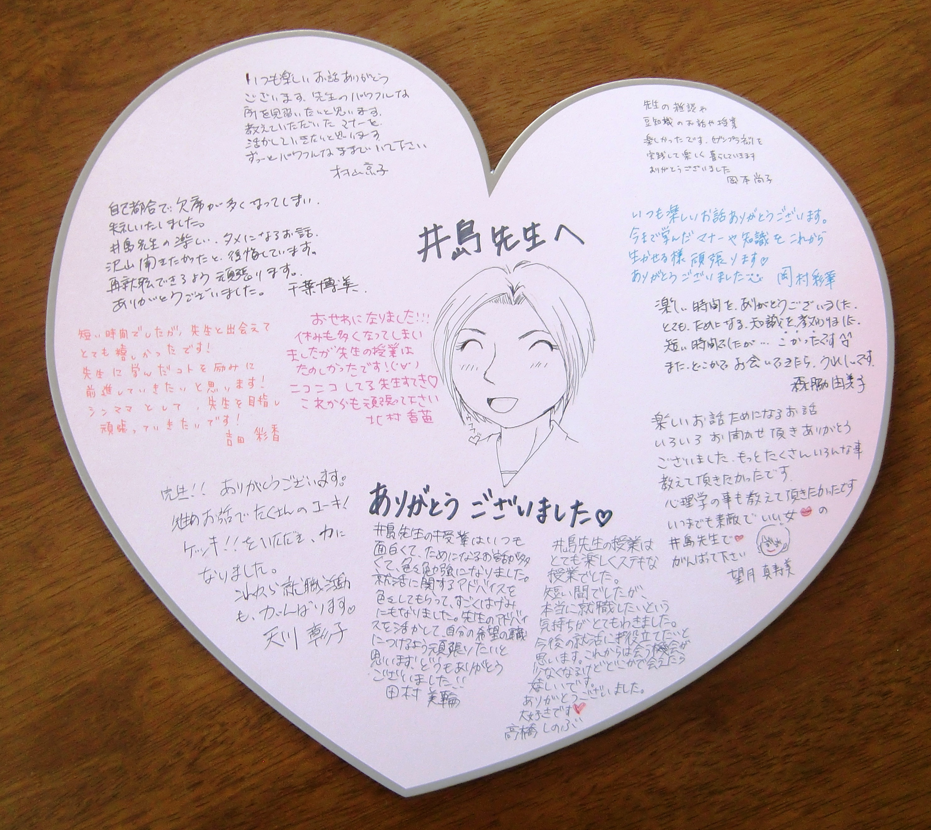 午前中の最後の授業を終えると、ちょっと若めに、そして美しめに描いた私の似顔絵入りの寄せ書きをいただきました!!